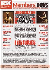 Fully-illustrated Performance Schedule for the eight plays which made up The Histories: RICHARD II, HENRY IV Parts I and II, HENRY V, HENRY VI Parts I, II & III, and RICHARD III; complete January to March 2008 Performance Schedule, ensemble list, colour photographs, Press comment, Events, Booking Information etc. [16pp, 5.75x8.25; VG] £2