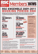 Stratford 2009 Season: THE WINTER'S TALE, AS YOU LIKE IT, JULIUS CAESAR, THE DRUNKS, THE GRAIN STORE and THE COMEDY OF ERRORS; Ticket Exchange and Resale; Website Information; Publication of RSC Editions of Individual Plays; THE TRAGEDY OF THOMAS HOBBES and THE CORDELIA DREAM at Wilton's Music Hall; ROMEO AND JULIET and DON JOHN at The Courtyard Theatre (2 photos); Stand Up For Shakespeare Schools Project (photo); THE TEMPEST at The Courtyard Theatre and On Tour (photo and Tour Schedule); RSC Fundraising Gala 2008; Transforming Our Theatres: Project Update etc. [6pp, 8.25x11.75; VG] £2