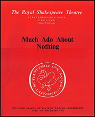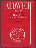 This magnificent large-size souvenir has a striking illustration extending across both covers; painted by Eden Box, it shows a boat bearing characters from the 1961 productions, sailing between the Shakespeare Memorial Theatre in Stratford (front cover), and the Aldwych Theatre in London (back cover) - click to see it. The souvenir itself is packed with photographs and colour designs, illustrating the whole range of the year's productions at Stratford and in London. Among the contents are: 6-page features (w. photographs & colour designs) on MUCH ADO ABOUT NOTHING (dir:Michael Langham, des:Desmond Heeley; w.Christopher Plummer, Geraldine McEwan, Ian Richardson, Maroussia Frank (his wife), Rosalind Knight, Clifford Rose, Jill Dixon, Noel Willman, Barry Warren, Newton Blick, Redmond Phillips, Tony Church), HAMLET (dir:Peter Wood, des:Leslie Hurry; w.Ian Bannen, Elizabeth Sellars, Peter McEnery, Barry Warren, Brian Murray, Noel Willman, Gordon Gostelow, Newton Blick, Russell Hunter, Geraldine McEwan), and RICHARD III (dir:William Gaskill, des:Jocelyn Herbert; w.Christopher Plummer, Edith Evans, Elizabeth Sellars, Michael Murray, Colin Blakely, Eric Porter, Esme Church, Tony Church, Terry Wale, James Kerry, William Wallis, Jill Dixon, Julian Battersby); further photographic features on AS YOU LIKE IT (dir:Michael Elliott, des:Richard Negri; w.Vanessa Redgrave, Ian Bannen, Colin Blakely, Rosalind Knight, Patsy Byrne), ROMEO AND JULIET (dir:Peter Hall; w.Zia Mohyeddin - replaced by Brian Murray, Dorothy Tutin, Max Adrian, Edith Evans), and OTHELLO (dir:Franco Zeffirelli; w.John Gielgud, Peggy Ashcroft, Dorothy Tutin); a photographic insert shows Paul Hardwick as Don Pedro and Claudius (late casting?); the assembled Stratford and London Companies are featured in two photographs; the Aldwych productions are represented by 4-page features (w. photographs & colour designs) on THE DEVILS - John Whiting (dir:Peter Wood, des:Sean Kenny & Desmond Heeley; w.Richard Johnson, Dorothy Tutin, Max Adrian, Patrick Wymark, Derek Godfrey, Clive Swift, Virginia McKenna, Stephanie Bidmead) and ONDINE - Giraudoux (dir:Peter Hall, des:Tanya Moiseiwitsch; w.Leslie Caron, Richard Johnson, Gwen Ffrangcon-Davies, Derek Godfrey, Diana Rigg, Ian Holm, Roy Dotrice, Peter Jeffrey, Eric Porter, James Bree, George Murcell), and further photographic features on TWELFTH NIGHT (dir:Peter Hall; w.Dorothy Tutin, Geraldine McEwan), BECKET - Anouilh (dir:Peter Hall; w.Christopher Plummer, Eric Porter) and THE DUCHESS OF MALFI - (dir:Donald McWhinnie; w.Peggy Ashcroft, Max Adrian, Patrick Wymark, Sian Phillips; with colour designs by Leslie Hurry)