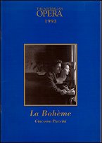 Australian Opera: Roger Lemke, David Hobson, Gary Rowley, David Lemke, Graeme Ewer, Cheryl Barker, Jin Tea Kim, Christine Douglas, John Bolton-Wood, John Fernon, Richard Alexander; c:Julian Smith, dir:Baz Luhrmann [60pp, 7.25x10.25; cast list, The Story of the Opera, biographies w.photos, article by Moffatt Oxenbould (Artistic Director), photographic feature on The Bohemians, double-page spread of costume designs, discography, photographic feature on Puccini, illustrated article on The Season of Youth, 2 production photos, list of 1993 opera performances in Sydney, Melbourne, and Brisbane, extensive company lists etc.; VG] £4